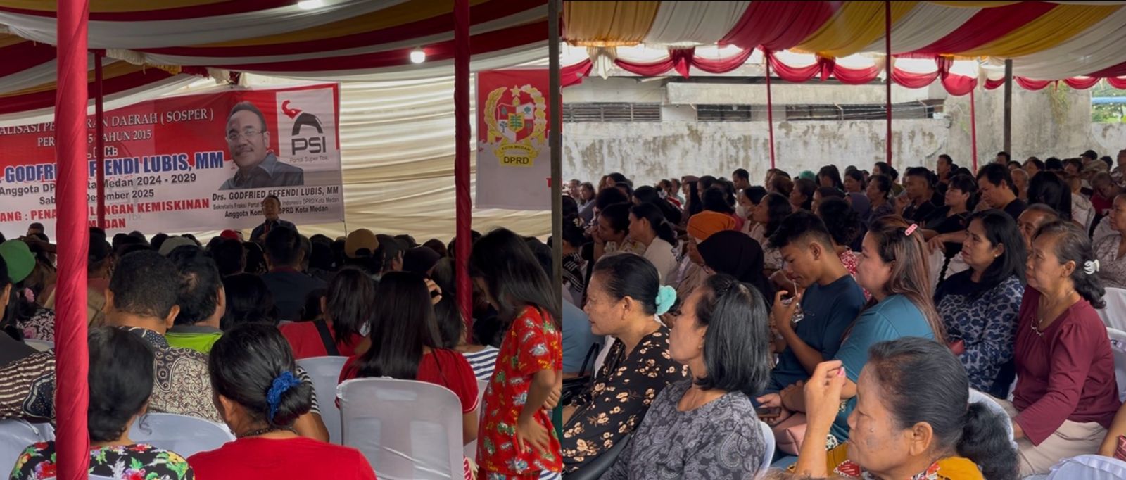 Medan, dahsyatnews.com — Warga Lingkungan 10 Kelurahan Binjai, Kecamatan Medan Denai, Kota Medan tampak tumpah ruah dan antusias menghadiri kegiatan Sosialisasi Peraturan Daerah (Sosperda) Nomor 5 Tahun 2015 tentang Penanggulangan Kemiskinan yang digelar Anggota DPRD Kota Medan Fraksi PSI, Drs. Godfried Effendi Lubis, M.M., di lapangan kosong sebelah Gereja Bethel Tabernakel, Jalan Menteng II, Sabtu (13/12/2025).