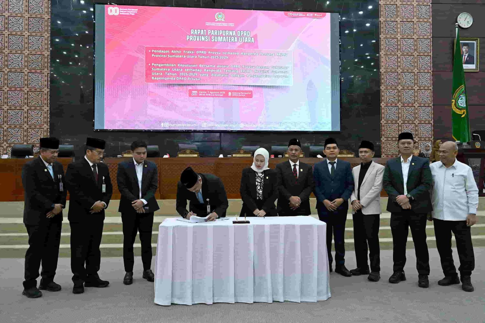 MEDAN, kedannews.com – Gubernur Sumatera Utara (Sumut) Muhammad Bobby Afif Nasution bersama Dewan Perwakilan Rakyat Daerah (DPRD) Sumut resmi menandatangani keputusan bersama terkait Rancangan Peraturan Daerah (Ranperda) Rencana Pembangunan Jangka Menengah Daerah (RPJMD) Sumut 2025-2029. Kesepakatan ini dicapai dalam Rapat Paripurna DPRD Sumut di Gedung DPRD Sumut, Jalan Imam Bonjol, Medan, Kamis (7/8/2025).