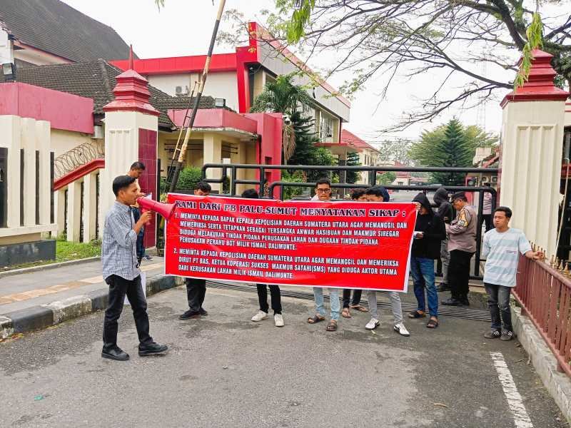 Medan, dahsyatnews.com – Dugaan perusakan lahan dan perahu milik warga Padang Lawas Utara disuarakan ke Mapolda Sumut oleh PB PALU Sumut, Jumat (30/1/2026). Aksi tersebut dilakukan sebagai bentuk solidaritas terhadap warga yang merasa dirugikan.