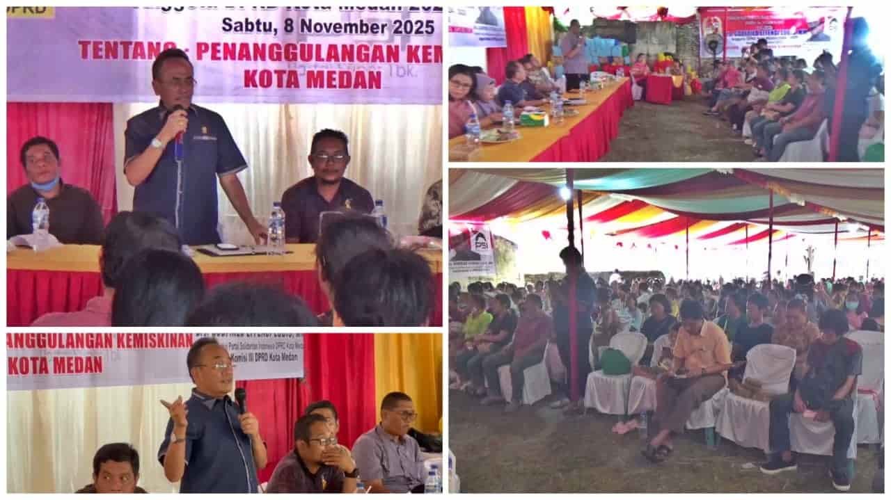 Medan, dahsyatnews.com — Warga memadati halaman Jalan M. Nawi Harahap / Jalan Seksama, Komplek Pemda Blok K, Lingkungan 3, Kelurahan Binjai, Kecamatan Medan Denai, Kota Medan, Sabtu (8/11/2025). Mereka antusias mengikuti Sosialisasi Peraturan Daerah (Sosperda) Nomor 5 Tahun 2015 tentang Penanggulangan Kemiskinan yang digelar oleh Anggota DPRD Medan Fraksi PSI, Drs. Godfried Effendi Lubis, M.M.